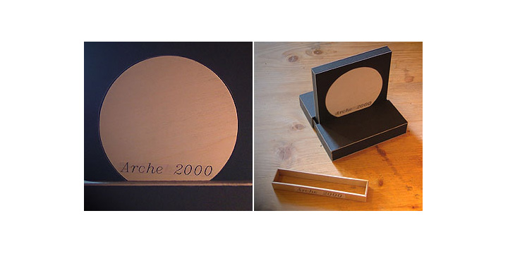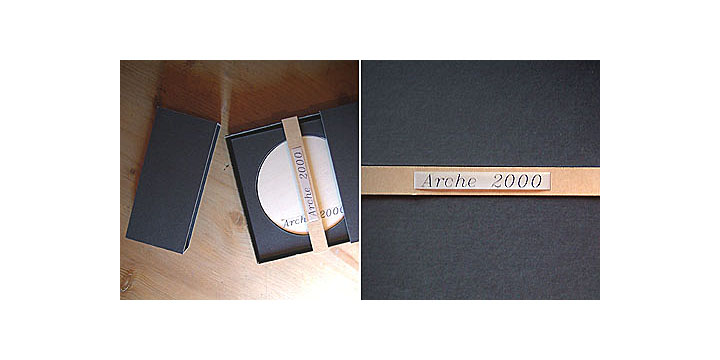 "Arche 2000" - Eine Münze aus Ton wird transportiert und präsentiert. Die Schachtel hat zwei abnehmbare Hälften, die Banderole in der Mitte wird zu einem Präsentband. Das Inlay der Schachtel legt sich wie ein Passpartout um die Münze.